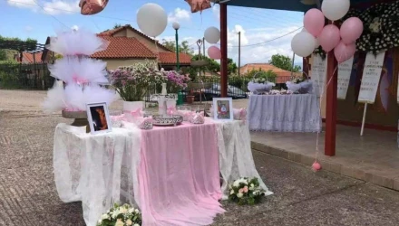Ο στολισμός της εκκλησίας του Αγίου Ιερόθεου παραπέμπει σε βάφτιση κι όχι σε κηδεία. Στον προαύλιο χώρο του ναού υπάρχουν ροζ και άσπρα μπαλόνια, ενώ σε δύο τραπέζια έχουν τοποθετηθεί κουφέτα και γλυκίσματα.