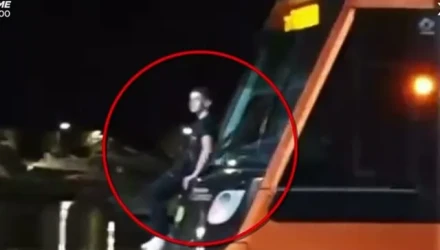 Σε άκρως επικίνδυνη πράξη επιδόθηκε ένας νεαρός, ο οποίος κρέμεται από συρμό του τραμ, το οποίο βρίσκεται εν κινήσει.
