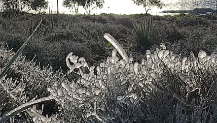 Οι εντυπωσιακές εικόνες με τα παγωμένα λουλούδια, ήρθαν από το χωριό Στεγνά, στην περιοχή του Αρχαγγέλου της Ρόδου και τις έβγαλε στο «φως» στο rodosreport.