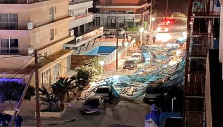 Σύμφωνα με το rodiaki.gr οι σκαλωσιές κατέρρευσαν και καταπλάκωσαν πάνω από 20 σταθμευμένα αυτοκίνητα που ήταν στο σημείο.