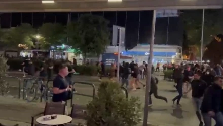 Βίντεο δείχνει Ολλανδούς οπαδούς να συμπλέκονται με Αλβανούς. Από τις μάχες σώμα με σώμα, ένας άνδρας σωριάζεται και μένει στο έδαφος.