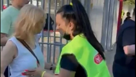 Μία γυναίακα σεκιούριτι διακρίνεται σε βίντεο να αγγίζει τις φιλάθλους και στο στήθος προκαλώντας βλέμματα απορίας από τους παρευρισκόμενους στην είσοδο της θύρας.