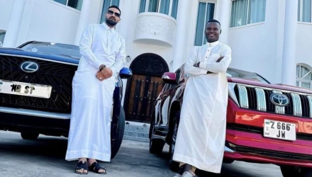 Σε ένα από αυτά φαίνεται με κελεμπία και παντόφλες να ποζάρει μπροστά σε δύο υπερπολυτελή αυτοκίνητα.