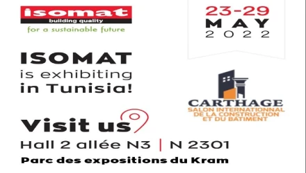 Η ISOMAT συμμετέχει στην 15η « SALON PROFESSIONNEL DE LA CONSTRUCTION ET DU BÂTIMENT « CARTHAGE », τη μεγαλύτερη διεθνή κατασκευαστική έκθεση της Τυνησίας, η οποία πραγματοποιείται στο εκθεσιακό κέντρο Kram στην Τύνιδα από τις 23 έως τις 29 Μαΐου. Στόχος της έκθεσης είναι να αναδείξει την καινοτομία και την ποικιλομορφία των προϊόντων στον οικοδομικό και κατασκευαστικό κλάδο, να ενισχύσει τη συνεργασία και να προωθήσει την εξαγωγή προϊόντων και τεχνογνωσίας.