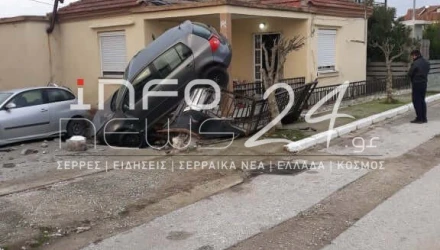 Σέρρες: Αυτοκίνητο “κρεμάστηκε” πάνω σε φράχτη σπιτιού