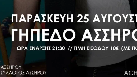 Στη σκηνή του γηπέδου της Δόξας Ασσήρου θα κάνει την εμφάνισή του ο λαϊκός τραγουδιστής Κωνσταντίνος Γαλανός όπου θα ξεσηκώσει τον κόσμο, όπως και ο Dj Αχιλλέας Μουρτσιώκης με τις μουσικές του επιλογές. Ωρα έναρξης 21:30 Είσοδος 10€ με ποτό