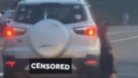Στο βίντεο, διάρκειας λίγων δευτερολέπτων, φαίνεται ο άψυχος γερμανικός ποιμενικός να κρέμεται από το λουρί του ενώ το αυτοκίνητο βρίσκεται εν κινήσει.