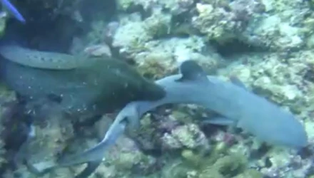 Ένας μικρός λευκός καρχαρίας προσπάθησε να κυνηγήσει σε έναν ύφαλο στα νερά της βορείου Αυστραλίας, όταν και βρέθηκε στα λημέρια μιας τεράστιας σμέρνας.
