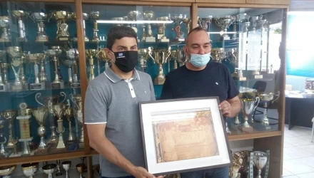 Ο πρόεδρος του ΓΣ Ηρακλής, Φώτης Θέος παρέδωσε στον κ. Αυγενάκη ένα πιστό αντίγραφο από το μετάλλιο που κατέκτησε ο ποδοσφαιρικός Ηρακλής στην μεσοολυμπιάδα του 1906.