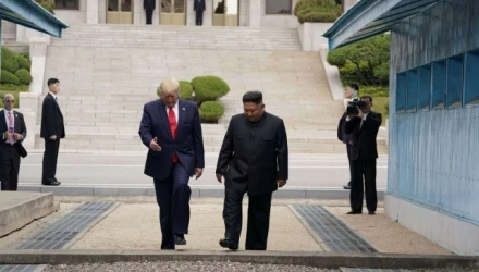 Ιστορική συνάντηση για τις σχέσεις των ΗΠΑ με τη Βόρεια Κορέα στην αποστρατικοποιημένη ζώνη της κορεατικής χερσονήσου μεταξύ του Ντόναλντ Τραμπ και του Κιμ Γιονγκ Ουν.
