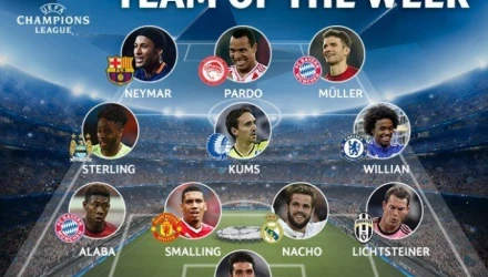 Αναλυτικά η ενδεκάδα: Μπουφόν (Γιουβέντους), Αλάμπα (Μπάγερν Μονάχου), Σμόλινγκ (Μάντσεστερ Γιουνάιτεντ), Νάτσο (Ρεάλ Μαδρίτης) και Λιχστάινερ (Γιουβέντους) στην άμυνα, Στέρλινγκ (Μάντσεστερ Σίτι), Κουμς (Γάνδη) και Γουίλιαν (Τσέλσι) στη μεσαία γραμμή, Πάρντο (Ολυμπιακός), Μίλερ (Μπάγερν Μονάχου) και Νεϊμάρ (Μπαρτσελόνα) στην επίθεση.