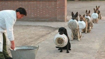 Η εικόνα σε αυτή την περίπτωση μιλά από μόνη της. Τα σκυλιά που βλέπετε είναι εκπαιδευμένα μέλη της κινεζικής αστυνομίας και φυσικά η αμοιβή τους δεν περιλαμβάνει τίποτα περισσότερο από ένα χορταστικό πιάτο φαγητό. Η αφοσίωσή τους όμως και η εκπαίδευσή τους είναι εντυπωσιακή ακόμη και την ώρα του φαγητού. Τα σκυλιά περιμένουν παραταγμένα στην ουρά με το μπολ για το φαγητό τους στο στόμα, μπροστά από τον υπάλληλο που έχει επιφορτιστεί με το τάισμά τους.