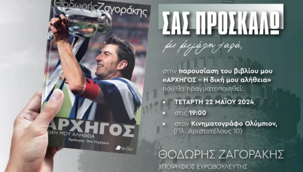 Ο εμβληματικός ηγέτης της Εθνικής Ελλάδος, Θοδωρής Ζαγοράκης κυκλοφορεί το πρώτο του βιβλίο με τίτλο «ΑΡΓΗΧΟΣ, Η ΔΙΚΗ ΜΟΥ ΑΛΗΘΕΙΑ», κάνοντας ανοιχτό κάλεσμα στους Θεσσαλονικείς προκειμένου να βρεθούν στην παρουσίαση του συγγραφικού του έργου και να μάθουν «άγραφες» ιστορίες από τις ένδοξες που φόρεσε το περιβραχιόνιο της γαλανόλευκης.