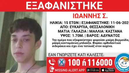 Ο Ιωάννης Σ. έχει καστανά μαλλιά, γαλανά μάτια, έχει ύψος 1,70 και είναι αδύνατος. Την ημέρα που εξαφανίστηκε φορούσε μαύρη βερμούδα, μαύρη κοντομάνικη μπλούζα, φοράει ορθοδοντικά σιδεράκια και έχει ένα τατουάζ στον αυχένα. Η ανακοίνωση από το Χαμόγελο του Παιδιού: Στις 11/06/2025 πρωινές ώρες, εξαφανίστηκε από την περιοχή της Ευκαρπίας στην Θεσσαλονίκης, ο Ιωάννης Σ., 15 ετών.