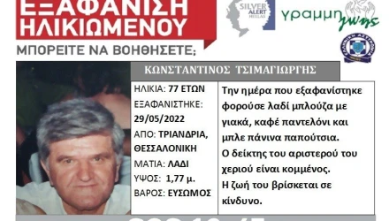 Πρόκειται για τον Κωνσταντίνο Τσιμαγιώργη, 77 ετών, ο οποίος εξαφανίστηκε χθες το απόγευμα από το σπίτι του στην Τριανδρία.
