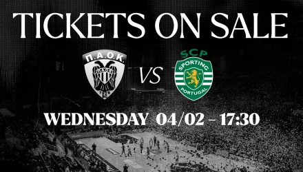«Η ΚΑΕ ΠΑΟΚ ανακοινώνει ό,τι ξεκίνησε η διάθεση των εισιτηρίων για τον αγώνα ΠΑΟΚ – Sporting CP που θα διεξαχθεί στο PAOK Sports Arena την Τετάρτη (4/2) στις 17:30 για την 5η αγωνιστική της δεύτερης φάσης του FIBA Europe Cup.