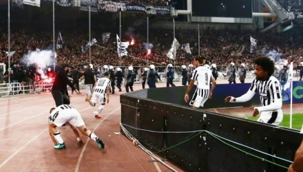 Έξαλλοι πανηγυρισμοί στο «ασπρόμαυρο» πέταλο έπειτα από την φανταστική εκτέλεση φάουλ του Βιεϊρίνια που έκανε το 1-0 για τον ΠΑΟΚ.