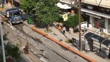 Πιο συγκεκριμένα, στη συμβολή των οδών Φιλελλήνων και Θερμοπυλών, κατά τη διάρκεια σκαπτικών εργασιών σε οικόπεδο για την ανέγερση οικοδομής έσπασε αγωγός ύδρευσης της ΕΥΑΘ. Ως αποτέλεσμα ο χώρος της εκσκαφής μετετράπη σε πισίνα και διεκόπη η υδροδότηση.