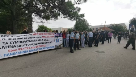 Οι υγειονομικοί αποδοκιμάζουν όσους προσέρχονται στη σύσκεψη και καλούν τον υπουργό να παραιτηθεί. Επίσης, αποδοκίμασαν και τον ίδιο τον υπουργό Υγείας κατά την προσέλευσή του.