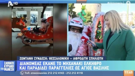 Δεν είναι λίγοι οι Θεσσαλονικείς που έχουν δει τον ευρηματικό αυτό διανομέα ντυμένο Άγιο Βασίλη, ο οποίος ς έντυσε τα πλάγια της μηχανής στα κόκκινα ενώ μπροστά τοποθέτησε δύο τάρανδους.