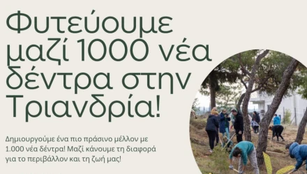 Ο Δήμος Θεσσαλονίκης και η Αντιδημαρχία Αστικού Πρασίνου και Περιβάλλοντος με τη συνεργασία της Διεύθυνσης Αναδασώσεων Κεντρικής Μακεδονίας, του Συλλόγου Μελισσοκόμων Θεσσαλονίκης και με τη χορηγία της ΑΜΚΕ ΠΗΓΗ προχωρούν την Κυριακή 19 Ιανουαρίου στη φύτευση 1000 ακόμη δένδρων στο, υπό διαμόρφωση, περιαστικό Δάσος Τριανδρίας (έκτασης 20 στρεμμάτων).