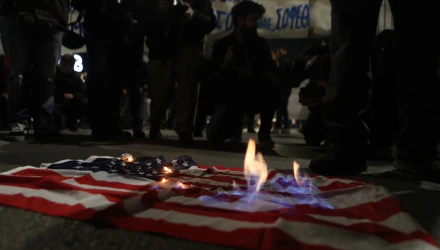 Διαδηλωτές που συμμετέχουν σε αυτή όταν η πορεία έφθασε έξω από την Αμερικάνικη Πρεσβεία πυρπόλησαν σημαίες των ΗΠΑ, του Ισραήλ αλλά και του ΝΑΤΟ.
