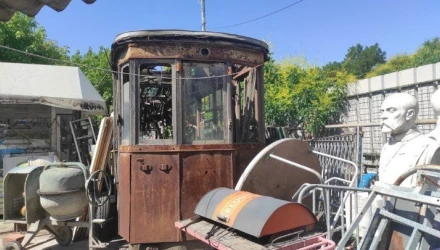 Σκουριασμένο, σπασμένο και εγκαταλελειμμένο για χρόνια σε μια αποθήκη, το τελευταίο βαγόνι του ιστορικού τραμ της Θεσσαλονίκης «μαραζώνει» σε μια γωνιά, ανάμεσα σε μπάζα, προτομές και μπετονιέρες.