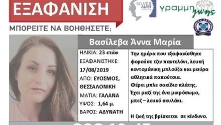 Την εξαφάνιση της 23χρονης Αννα Μαρία Βασίλεβα από την περιοχή του Ευόσμου Θεσσαλονίκης γνωστοποιεί με ανακοίνωσή της, η Γραμμή Ζωής.