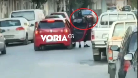 Όπως θα δείτε στο βίντεο που δημοσιεύει το Voria, το οποίο τράβηξε ένας περαστικός, το κόκκινο αυτοκίνητο σταματάει στη μέση της οδού Βενιζέλου και από μέσα βγαίνει ένας άνδρας που, κρατώντας επιδεικτικά την καραμπίνα του, κόβει την κυκλοφορία.