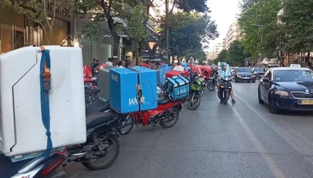 Μοτοπορεία πραγματοποίησαν το απόγευμα της Δευτέρας (26/6) στο κέντρο της Θεσσαλονίκης διανομείς για τα εργατικά δυστυχήματα, με αφορμή το τροχαίο δυστύχημα το μεσημέρι στην Τσιμισκή με αποτέλεσμα τον θάνατο ενός συναδέλφου τους.