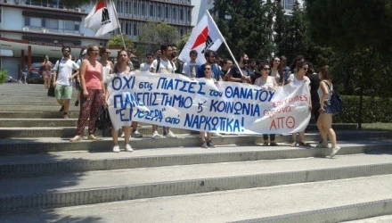 Πορεία στους χώρους τους Αριστοτελείου Πανεπιστημίου Θεσσαλονίκης πραγματοποίησαν φοιτητές του "Μετώπου Αγώνα Σπουδαστών" σχετικά με την εγκληματικότητα και το πρόβλημα των ναρκωτικών που είναι σε έξαρση στην Πανεπιστημιούπολη.