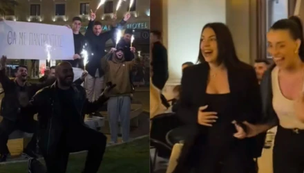 Εκεί, ένας νεαρός, με τη συνδρομή φιλικών του προσώπων, οργάνωσε... έκπληξη έξω από γνωστή καφετέρια, όπου καθόταν ανυποψίαστη η αγαπημένη του. Κάποια στιγμή, η κοπέλα, που ήταν αμέριμνη, είδε γύρω της πανό, πυρσούς και χειροκροτήματα, και δέχτηκε την πρόταση γάμου του αγαπημένου της.