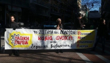 Η Ταξική Πορεία και η Πρωτοβουλία Νέων Εργαζομένων και Ανέργων με κύριο σύνθημά τους το ''Καμία ανοχή στην καθημερινή εργασιακή βαρβαρότητα'' διαμαρτυρόνται απέναντι από το κατάστημα Everest που βρίσκεται στη διασταύρωση των οδών Τσιμισκή και Ικτίνου.