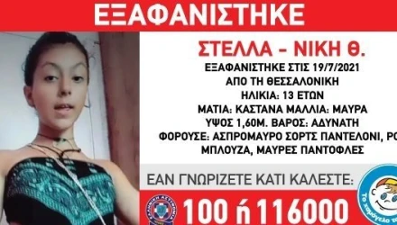 Στις 19/07/2021 βραδινές ώρες, εξαφανίστηκε από τη Θεσσαλονίκη, η Στέλλα-Νίκη Θ. 13 ετών. Κατόπιν αιτήματος της οικογένειάς της σήμερα, 22/07/2021, «Το Χαμόγελο του Παιδιού» προέβη άμεσα στην δημοσιοποίηση των στοιχείων της ανήλικης.
