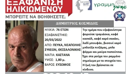 Πρόκειται για τον Δημήτριο Κοσμίδης, 76 ετών, ο οποίος εξαφανίστηκε από το σπίτι του, στην περιοχή Πεύκα του δήμου Νεάπολης-Συκεών, όταν βγήκε για την καθιερωμένη του βόλτα και δεν επέστρεψε ποτέ.