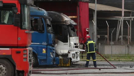 Σύμφωνα με πληροφορίες, η φωτιά ξέσπασε σε φορτηγό και στη συνέχεια επεκτάθηκε σε τουλάχιστον άλλα τρία φορτηγά, ενώ πυκνοί καπνοί κάλυψαν την περιοχή.