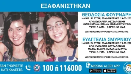Την εξαφάνιση της 24χρονης Ευαγγελίας Σμυρνιού και της 51χρονης Θεοδοσίας Φούρναρη από την Ευκαρπία Θεσσαλονίκης στις 19 Μαρτίου ανακοίνωσε το Χαμόγελο του Παιδιού.