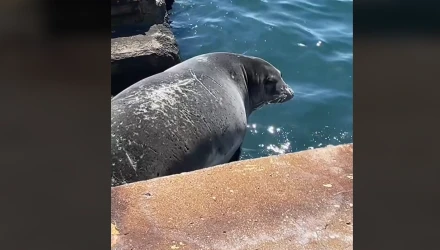 Όπως φαίνεται και στο μοναδικό βίντεο που ανήρτησε χρήστης του TikTok, η φώκια κάθισε σε ένα από τα γνωστά σκαλάκια του λιμανιού, για να απολαύσει τον ήλιο.