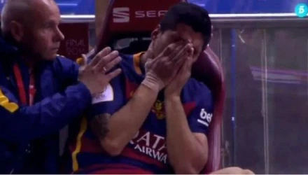 Στο 57ο λεπτό ο Λουίς Σουάρες υπέστη θλάση κι αποχώρησε από τον τελικό Κυπέλλου Ισπανίας μεταξύ της Μπαρτσελόνα και της Σεβίλλης. Ο Ουρουγουανός έβαλε τα κλάμματα κατά την αποχώρησή του από τον αγωνιστικό χώρο.