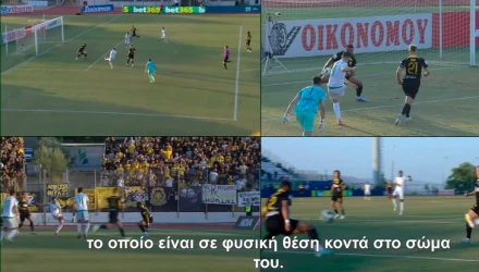 Σε ό,τι έχει να κάνει με το ακυρωθέν γκολ του Άρη, το οποίο ξεκίνησε από σουτ του Μόντσου, τονίζει ότι η μπάλα βρίσκει στο χέρι του Σαμόρα, άρα εμπίπτει στον σχετικό κανονισμό.