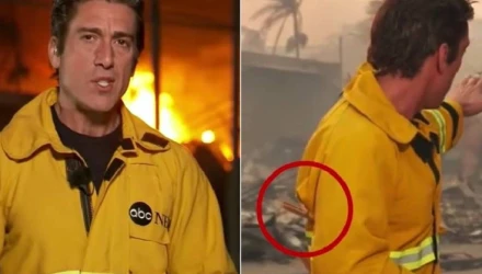 Οι φονικές πυρκαγιές στο Λος Άντζελες προκαλούν θλίψη και τεράστια καταστροφή. Μέσα σ’ αυτό το κλίμα τηλεπαρουσιαστής του ABC News φόρμα πυροσβέστη με... μανταλάκι στην πλάτη του, για να δείχνει fit!