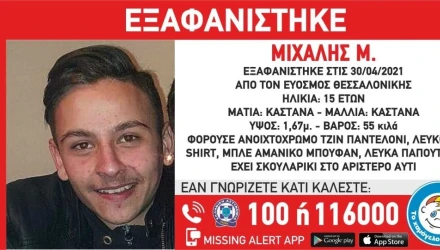 Στις 30/4/2021 πρωινές ώρες, εξαφανίστηκε από το σπίτι του στον Εύοσμο Θεσσαλονίκης, ο Μιχάλης Μ. 15 ετών. Ο Μιχάλης έχει ύψος 1,67 μ., ζυγίζει 55 κιλά, έχει καστανά μαλλιά και καστανά μάτια. Φορούσε ανοιχτόχρωμο τζιν παντελόνι, λευκό T-shirt, μπλε αμάνικο μπουφάν, λευκά παπούτσια και έχει σκουλαρίκι στο αριστερό αυτί.