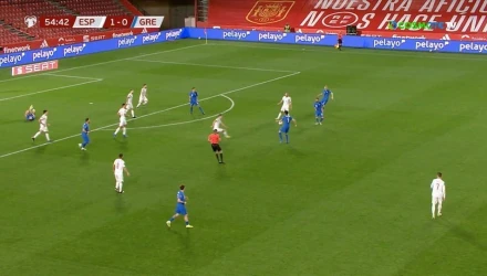 Μπορεί η Ελλάδα να μην απείλησε καθόλου την Ισπανία αλλά εκμεταλλευόμενη ένα λάθος μαρκάρισμα του Μαρτίνεθ έφτασε στην ισοφάριση. Ο αμυντικός των Ισπανών έδιωξε την μπάλα αλλά με σκαριά χτύπησε τον Μασούρα στο γόνατο και ο διαιτητής υπέδειξε το πέναλτι στο 57'. Ο Μπακασέτας ανέλαβε την εκτέλεση και έστειλε την μπάλα στα δίχτυα.