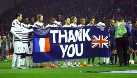 Υπόκλιση στην Αγγλία για την τεράστια στήριξή της στη Γαλλία μετά τα τραγικά γεγονότα του Παρισιού έκανε η Μπορντό. Οι παίκτες των «Γιρονδίνων» είπαν «ευχαριστώ» με πανό που σήκωσαν στο Λίβερπουλ.