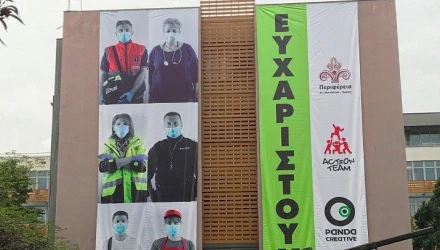 Με τη συνδρομή της εθελοντικής ομάδας νέων της Action Team και του Καβαλιώτη γραφίστα Κυριάκου Αντωνιάδη που εργάστηκε αφιλοκερδώς, το πρωί της Κυριακής, με τη βοήθεια ενός γερανοφόρου οχήματος, η πίσω όψη του διοικητηρίου «ντύθηκε» με ένα υπερμεγέθη πανό που ξεπερνούσε σε ύψος τα 15 μέτρα. Πάνω σ' αυτό παρουσιάζεται η καμπάνια «Ευχαριστούμε», στην οποία πρωταγωνιστούν έξι Καβαλιώτες που αντιπροσωπεύουν ο καθένας ένα από τα επαγγέλματα που δεν σταμάτησαν να εργάζονται σε όλη τη διάρκεια της εφαρμογής των μέτρων.