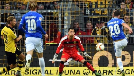 H νεοφώτιστη ομάδα προηγείται στο ημίχρονο της Μπορούσια Ντόρντμουντ με 1-0. Σκόρερ για την Ντάρμσταντ ο Έλερ Μαρσέλ στο 17ο λεπτό της αναμέτρησης.