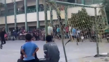 Σ' αυτό φαίνονται δεκάδες εκτοπισμένες οικογένειες στο προαύλιο του σχολείου να ζητωκραυγάζουν για τα παιδιά που έπαιζαν ποδόσφαιρο, προτού επικρατήσει πανικός από τον ισραηλινό βομβαρδισμό.