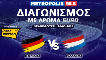 To METROPOLIS 95,5 και η Interwetten.gr στέλνουν ένα τυχερό με ένα φίλο ή φίλη του, στις 26 Μαρτίου στη Φρανκφούρτη, να παρακολουθήσουν τον τελευταίο φιλικό αγώνα, πριν το EURO 2024, μεταξύ της ΓΕΡΜΑΝΙΑΣ και της ΟΛΛΑΝΔΙΑΣ, με εισιτήρια του αγώνα, αεροπορικά και διαμονές.