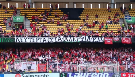 Αντιδράσεις προκάλεσε πανό που υψώθηκε από τους φίλους του Ολυμπιακού στις κερκίδες της OPAP ARENA πριν τη σέντρα του τελικού του Europa Conference League.