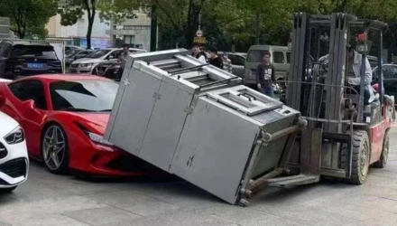 Το αστείο της υπόθεσης όμως είναι ότι ο οδηγός του περονοφόρου ήταν ιδιαίτερα άτυχος, μιας και από όλα τα σταθμευμένα αυτοκίνητα στο σημείο, ο φούρνος έπεσε πάνω στο ακριβότερο, μία Ferrari F8 Tributo.